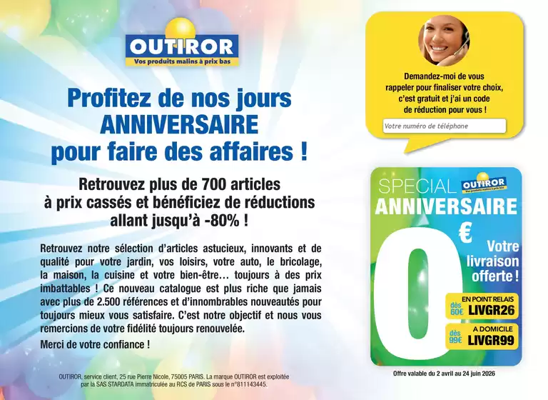 Outiror cest le spécialiste du jardin, du bricolage, de la maison, des loisirs, de lautomobile... En plus de proposer des milliers de références, Outiror est reconnu pour ses prix qui défient toute concurrence. Chez Outiror, vous pourrez trouver des housses, des pelles, des brouettes, des bâches, des produits dentretien, des accessoires cuisine etc. Tout pour vous aider à la maison. Nhésitez pas à consulter le dernier Outiror catalogue.