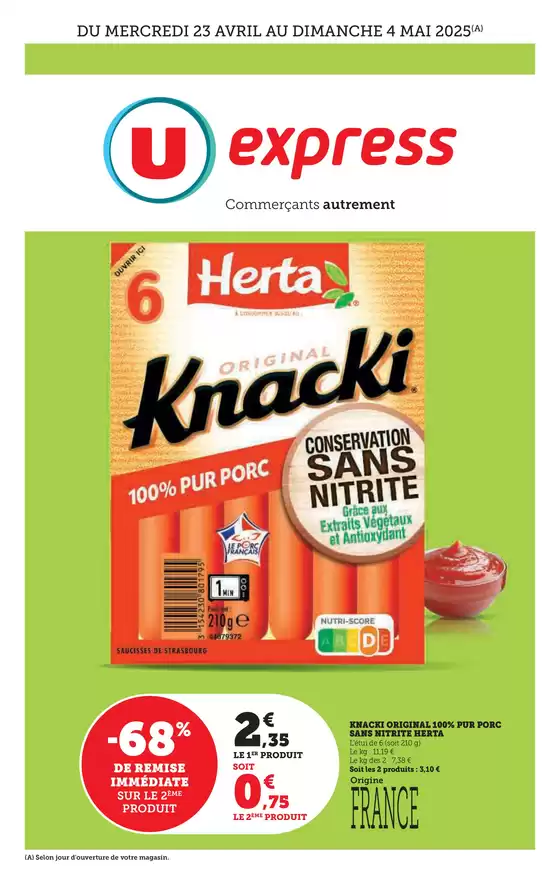 Cette semaine, profitez également de rabais sur le dentifrice Colgate et la lessive en capsules Le chat, visibles dans le catalogue spécial beauté valide du 18 au 30 mars. Ne manquez pas ces offres exceptionnelles chez U Express à %{city} ; consultez notre page dédiée pour les horaires et implantations de nos magasins, afin de réaliser vos achats tout en économisant sans sacrifier la qualité.