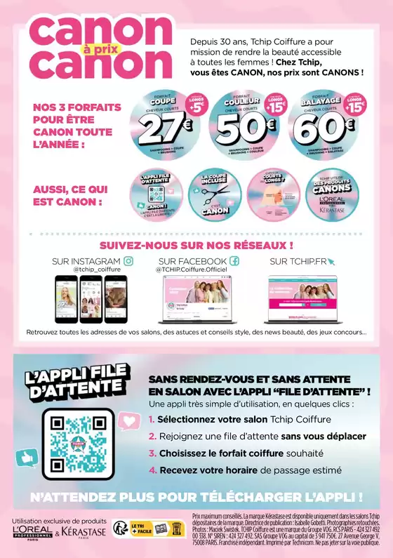 Tchip coiffeur cest un salon de coiffure à prix discount. Le salon Tchip vous accueille près de chez vous pour vous faire la coiffure de vos rêves. Votre coiffeur Tchip sera à votre écoute pour toutes les coupes courtes, longues, brushing, couleur... Tous les produits utilisés par lenseigne sont dans les numéros 1 de la coiffure : loréal pro et kerastase. Faites vous une coiffure Tchip ! Nhésitez pas à consulter les prix Tchip en ligne pour vous faire une idée. Avant de vous rendre au salon noubliez pas de consulter lhoraire tchip !
